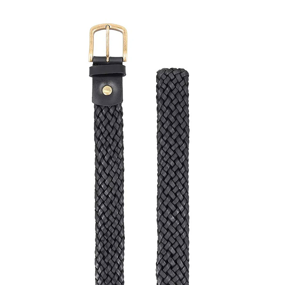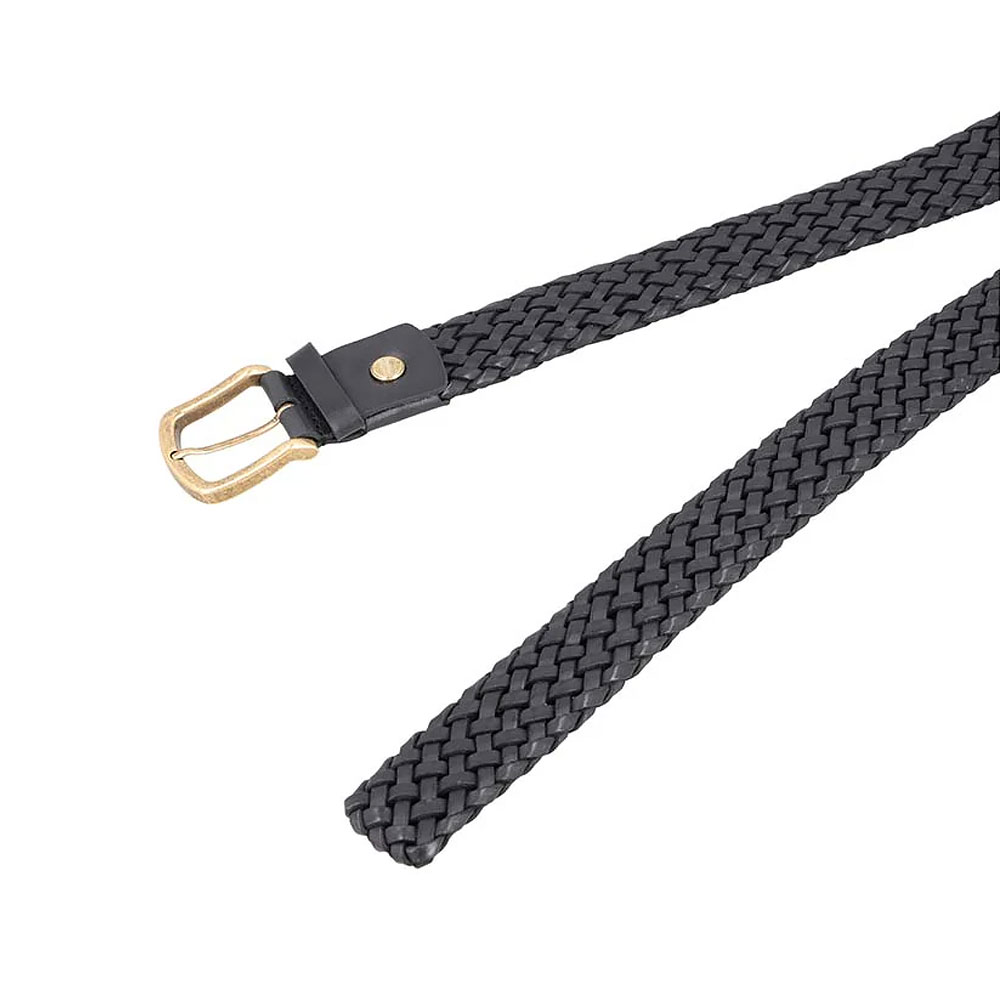 Flexible black braided belt featuring gold hardware. Offers a perfect, comfortable fit for all waist sizes.